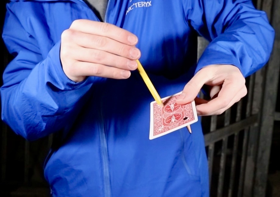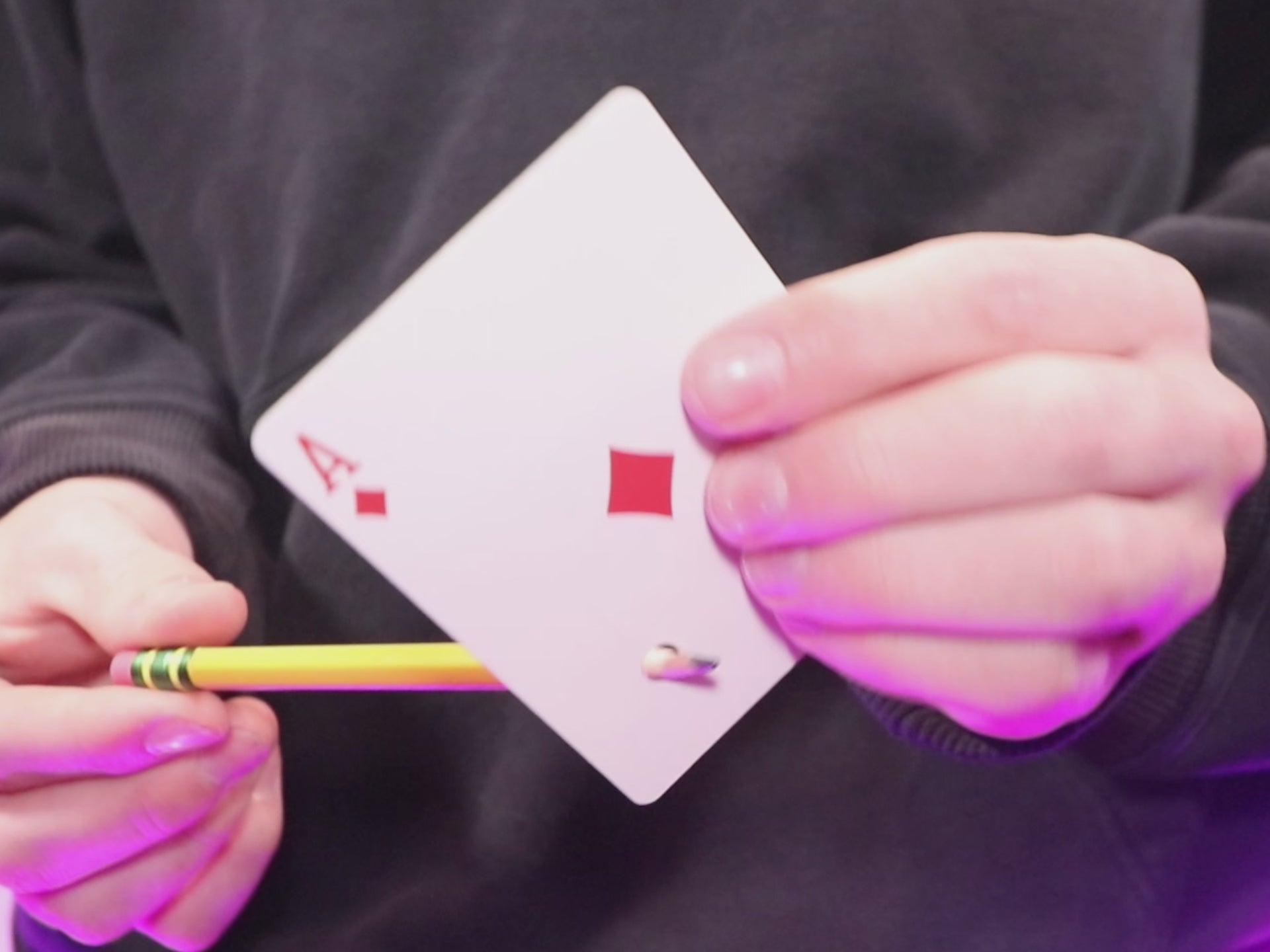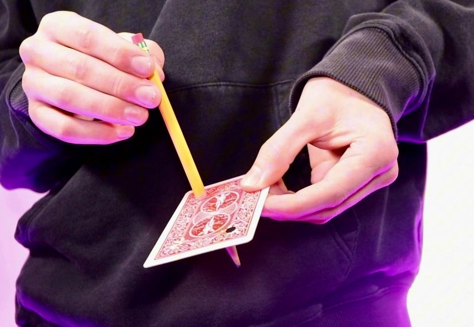 Display a pencil and playing card with one hole punched through and a black sticker placed on the front. The performer then holds the card flat in the air as they approach the real hole with the tip of a pencil. As the pencil breaches the hole in the card, the audience sees the tip of the pencil poke out of the sticker on the opposite side of the card. The pencil is then removed and then the card is shown on the front and back. The pencil and the card and be shown and handed out before and after the visual is performed.